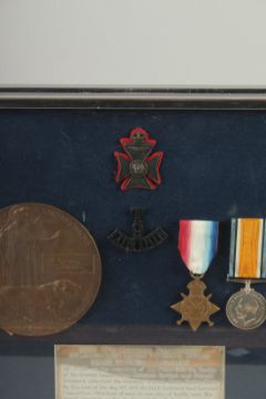 A GROUP OF THREE MEDALS AND BRONZE DEATH PLAQUE.