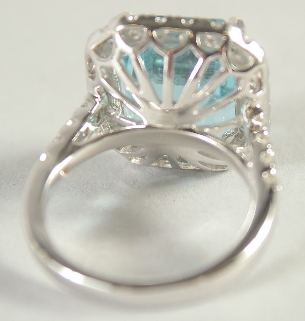 A VERY GOOD 18CT WHITE GOLD AQUAMARINE AND DIAMOND RING, the aquamarine of approx. 10 carats.