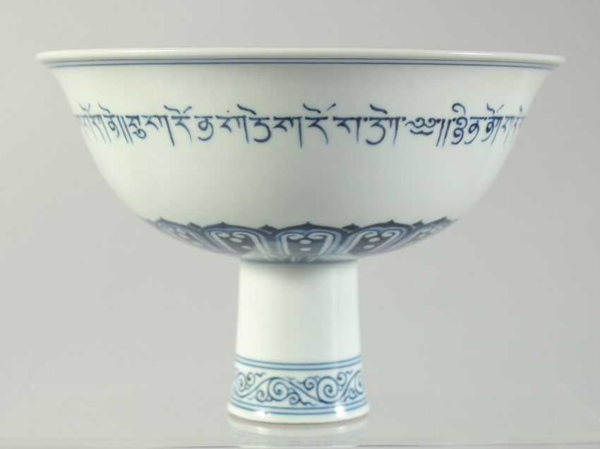A BLUE AND WHITE PORCELAIN PEDESTAL BOWL, the exterior with a band of characters, interior centre with six-character mark, cup 17.5cm diameter.
