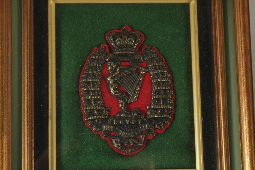 A FRAMED AND GLAZED ROYAL IRISH RIFELS BADGE.