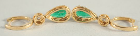 A PAIR OF VERY FINE 18CT YELLOW GOLD, EMERALD AND DIAMOND PEAR SHAPED DROP EARRINGS.