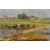 A river scene with cattle at the water's edge, logs gathered and a path through to the other side with dwellings in the distance, oil on board, indistinctly signed, 11.75" x 17.75", (30x45cm).