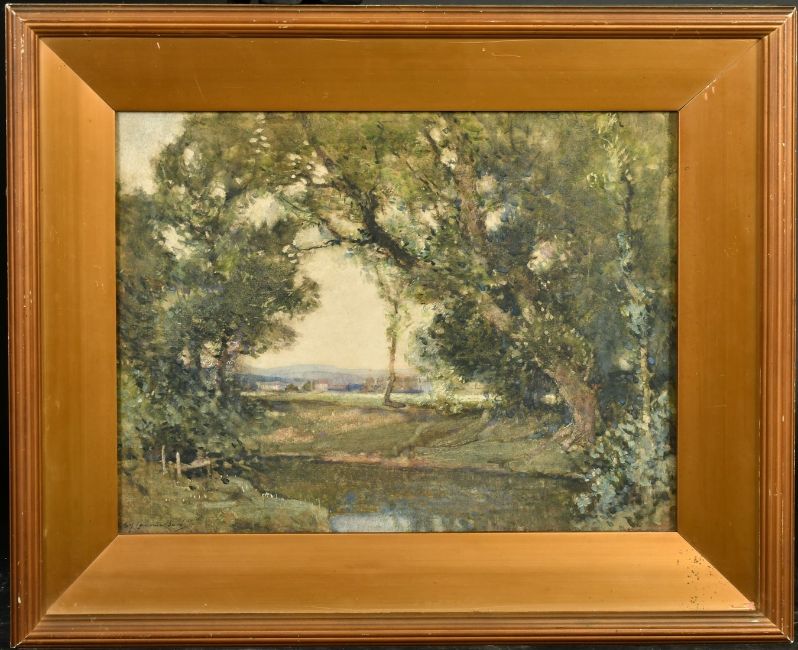 Samuel John Lamorna Birch, a woodland pool with a distant town beyond, watercolour, signed, 13" x 17", (33 x 43cm).