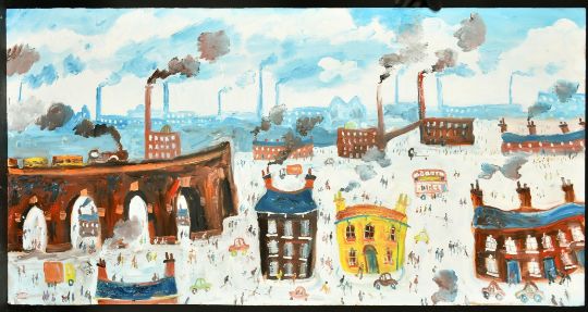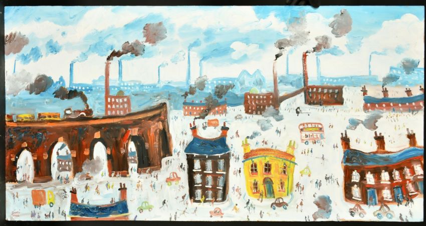 Simeon Stafford (b. 1956) British, 'Stockport', a view of figures amongst factory buildings, oil on panel, signed, inscribed verso, 24" x 48", (61 x 122cm), (unframed).