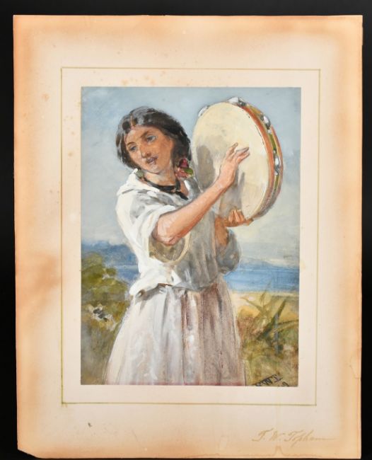 Attributed to Francis William Topham (1808-1877), a watercolour sketch of a young beauty playing a tambourine with a coastal view beyond, signed with initials, 9.5" x 6.75" (25 x 17cm) unframed.