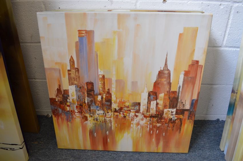 Colourful abstract and landscape scenes, oil on canvas, unframed, a set of eight.