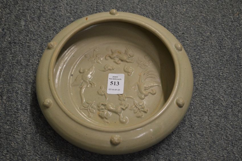 A Chinese molded pottery circular brush washer.