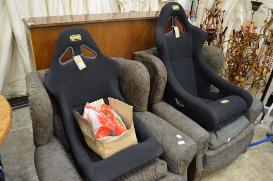 A pair of OMP car racing seats with harnesses, appear unused.