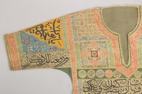 A 20TH CENTURY ISLAMIC OTTOMAN TALISMANIC HAND-PAINTED SHIRT / JAMA, the reverse painted with a panel of Mecca and emblem, the cotton shirt with calligraphy all over and foliate motifs with fine gilt highlights.