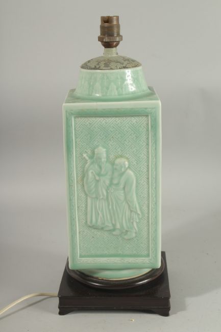 A CHINESE CELADON GLAZE SQUARE FORM VASE LAMP, mounted to a hardwood base, the vase with relief panels of figures, (fitted for electricity but untested), shade included, 69cm high overall.