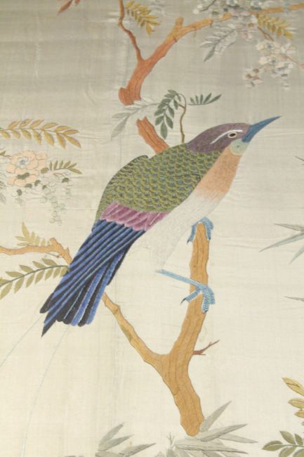 A VERY LARGE AND IMPRESSIVE PAIR OF EARLY 20TH CENTURY CHINESE SILK PANELS, finely decorated with peacocks and other birds as well as insects, butterflies, and flora, 287cm x 129cm.