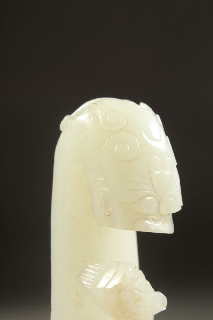 AN 18TH CENTURY CHINESE CARVED JADE DRAGON AND CHILONG BELT HOOK, 12cm long.