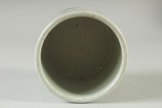 A CHINESE FAMILLE VERTE PORCELAIN BRUSH POT, painted with figures, 13cm high.