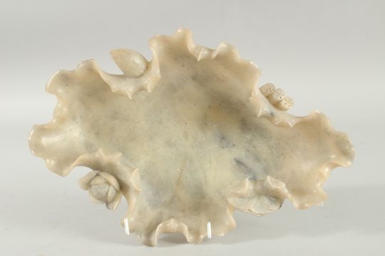 A LARGE CHINESE SOAPSTONE LEAF FORM DISH / BRUSH WASHER, 32cm long.