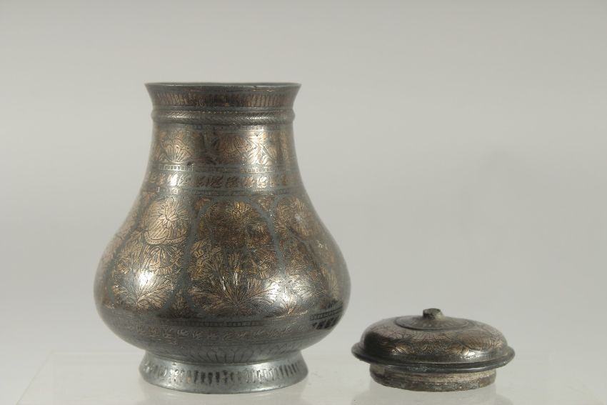 A 19TH CENTURY INDIAN BIDRI SILVER INLAID LIDDED POT, 12cm high.