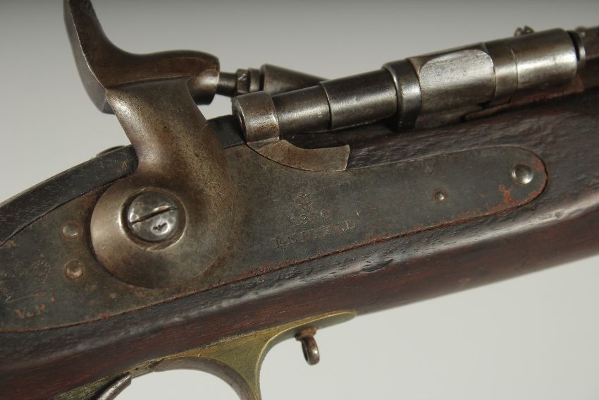 .577 five groove rifled barrel, ladder rear sight graduated to 600 yards, Mark III Snider breech, flat side lock engraved '1870 Enfield', Crown VR on the tail & Ordnance inspector's marks. Walnut half stock with brass mounts, trap in butt for ramrod (now lacking), butt with Enfield roundel & Sold Out of Service mark.