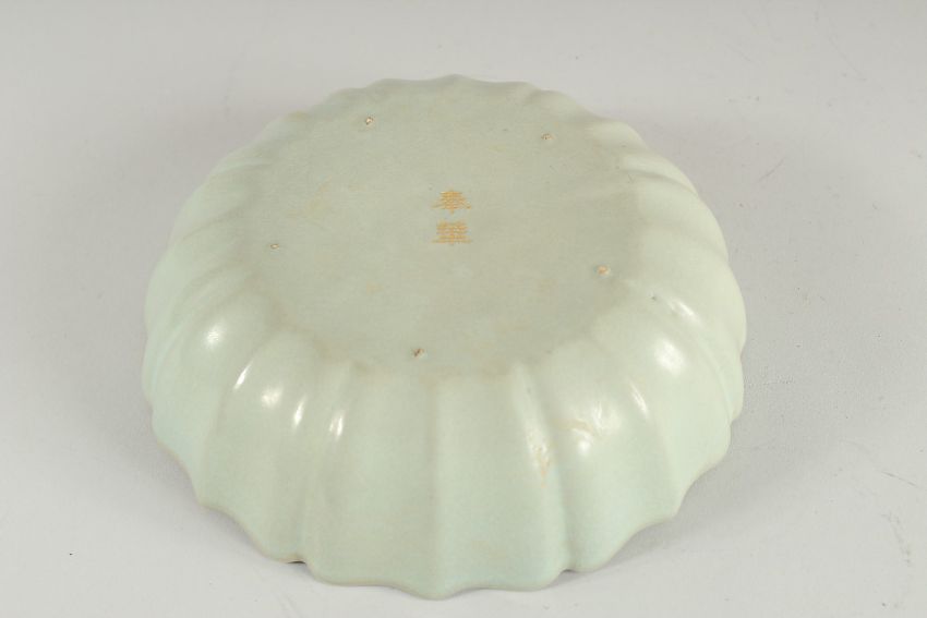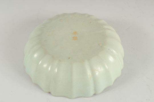 A CHINESE PETAL SHAPE CELADON BOWL, the interior with characters.