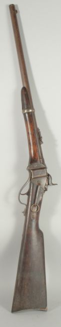 39" overall with 22" .50 barrel retained by a single band, with three groove rifling, ladder rear sight. Action stamped 'R.S. Laurence Pat April 12th 1859.' & 'C. Sharp Pat. Oct 5th 1852'. Numbered 75312. Walnut two piece full stock with iron furniture, including sling bar. Originally a percussion gun converted to metallic cartridge post war. Circa 1865. Good condition, butt plate rusted. Carbine number 75312 was issued to Corporal George W Taylor of the 10th Illinois Volunteer Cavalry, with some pages of research.