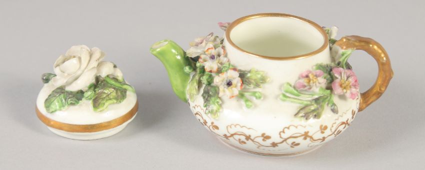 A 19TH CENTRUY ROCKINGHAM MINIATURE TEA POT AND COVER encrusted with flowers, printed griffin mark.
