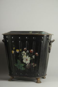 A PAIR OF TOLEWARE COAL BUCKETS AND COVERS painted with flowers.