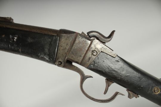 A SHARP'S TYPE SLANT BREECHED PERCUSSION RIFLE. 57" overall, 39" 4 calibre barrel retained by 3 sprung bands, ladder rear sight. Falling block percussion action, black painted 2 piece stock, no visible marks. Circa 1865. Quite good condition, pivot pin loose, poor quality, possibly a Confederate copy.