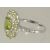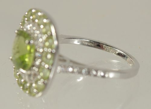 A 9CT WHITE GOLD DIAMOND AND PERIDOT RING.