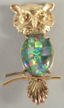 A SMALL GOLD OPAL SET OWL BROOCH.