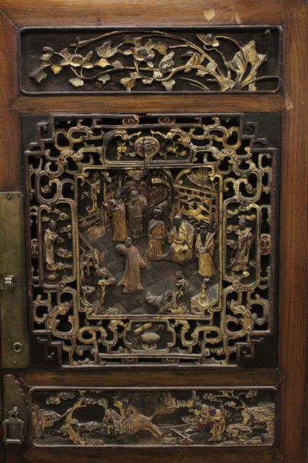 A 19TH CENTURY CHINESE CABINET with carved and pierced doors.