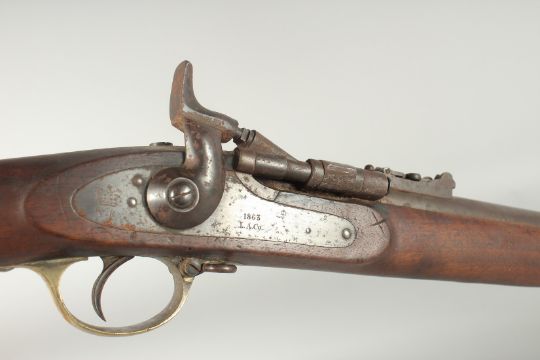 55" overall, 36" barrel with 3 groove rifling, ladder rear sight graduated to 800 yards, flat side lock stamped '1863' over 'LA Co', Crown VR on the tail. Walnut full stock with brass mounts, stamped on the butt 'London Armoury Company 1863'. Dated 1863.