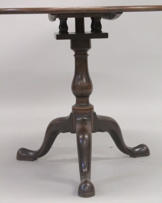 A LARGE GEORGE III MAHOGANY CIRCULAR TOP TABLE with birdcage support, centre turned pillar ending in pad curving legs.