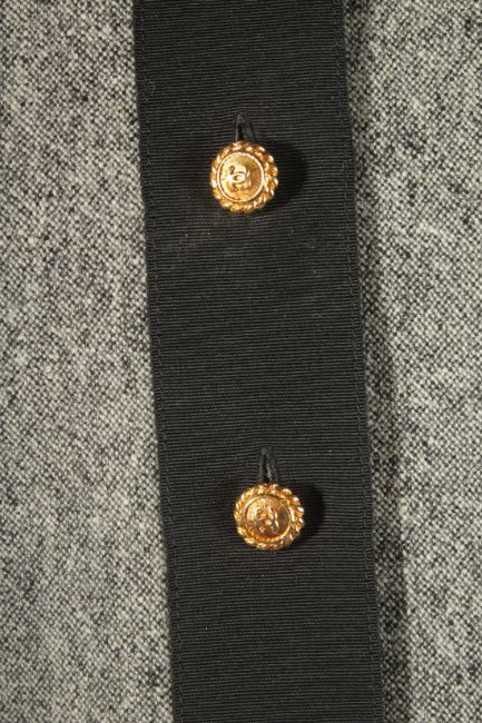 A CHANEL GREY DRESS, with black trim and bow, Chanel double C buttons.