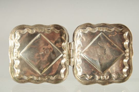 A DUTCH SQUARE ENGRAVED SILVER PILL BOX.