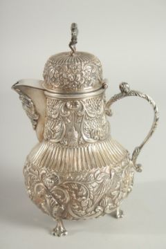 A GOOD CONTINENTAL SILVER COFFEE POT with all over repousse decoration supported on three claw feet.