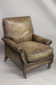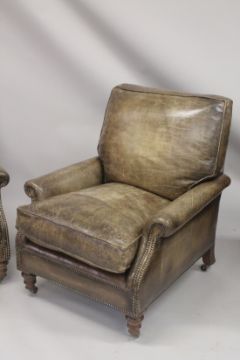 A SUPERB PAIR OF LEATHER ARMCHAIRS with brass studs on turned legs, with brass casters.