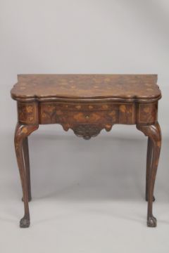 A NEAR PAIR OF 18TH CENTURY DUTCH MARQUETRY FOLDING TOP CARD TABLES inlaid with flowers, birds and insects, the folding top with baize cover, with a single baize drawer and supported on cabriole legs, ending in claw and ball feet.