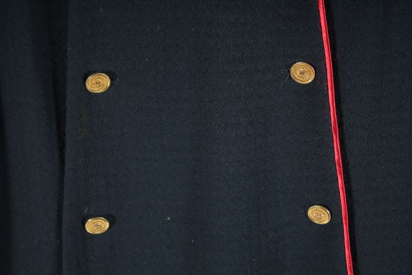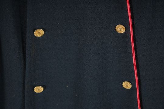 A CHANEL NAVY BLUE CLASSIC DRESS with red trim and Chanel gilt buttons.