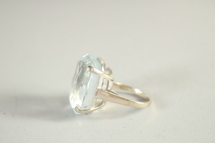 A LARGE 14CT WHITE GOLD AQUAMARINE SINGLE STONE RING.
