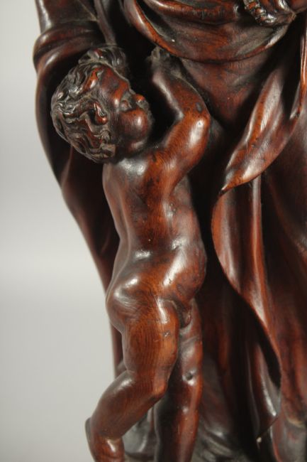 AN 18TH CENTURY CONTINENTAL CARVED WOOD MADONNA AND CHILD with a cupid, on a rectangular base.