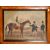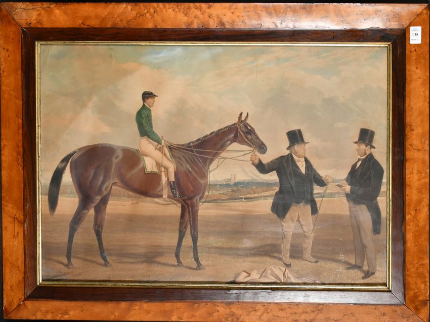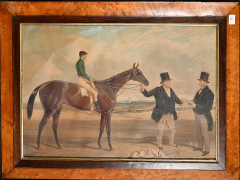 A 19th Century hand coloured aquatint of a race horse with jockey up and a gentlemen holding the rains and another standing by 17.25" x 24.5", (44x62.5cm) in an unusual maple and hardwood veneered frame (a/f).