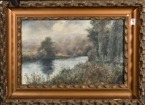 H. Ponson, late 19th Century, a riverside view with wildflowers in the foreground, oil on canvas, signed, 14" x 21" (36 x 54cm).