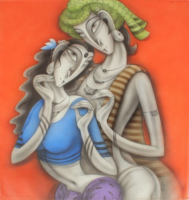 Ramesh Pachpande (b. 1954) Indian, 'Happy Couple', acrylic on canvas, signed and dated 2016, 30" x 24" (76 x 61cm), unframed and unstretched.