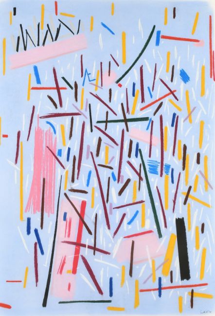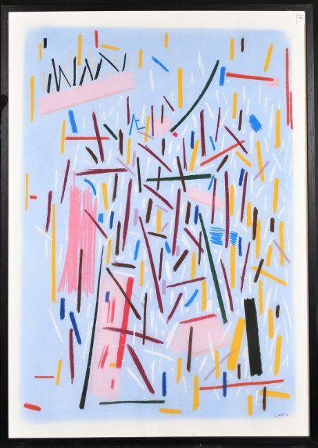 Andrew Southall (b. 1947), Untitled abstract in pink, crimson, yellow, brown, white, blue, red and black, signed and dated '88, 41" x 28.75", (104x73cm).