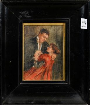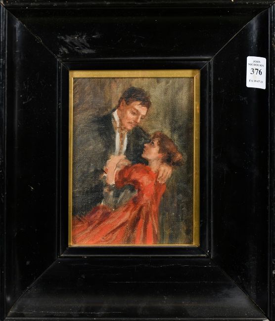Circa 1900, an oil sketch of figures in embrace, 6.75" x 4.75", (17 x 12cm).
