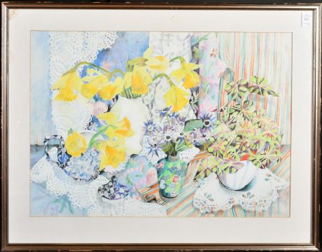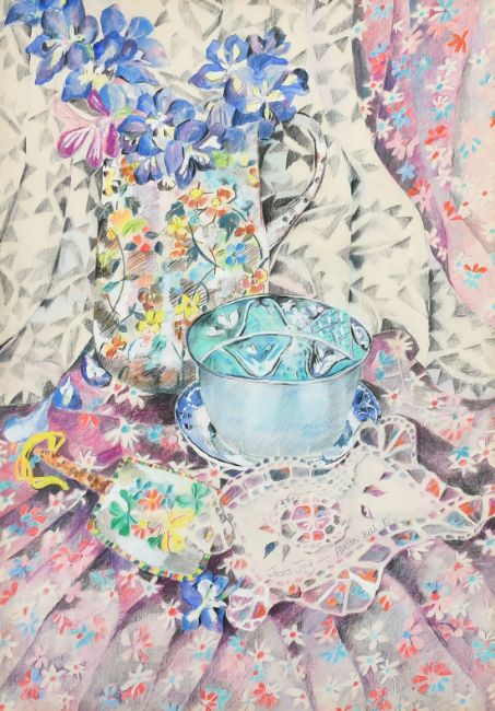 Alison Hill (20th Century) Flowers in vases and china on a table top, coloured crayons, signed and dated March 1986 in pencil, 16" x 22.5", (40.5x57.5cm) along with another titled 'Jeans Jug', signed and dated '85, 18" x 12.25", (45.5x31cm) (2).
