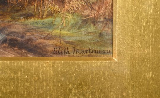 Edith Martineau (1842-1909), a female figure with a wheelbarrow on a woodland track, watercolour, signed, 18" x 14" (46 x 36cm).