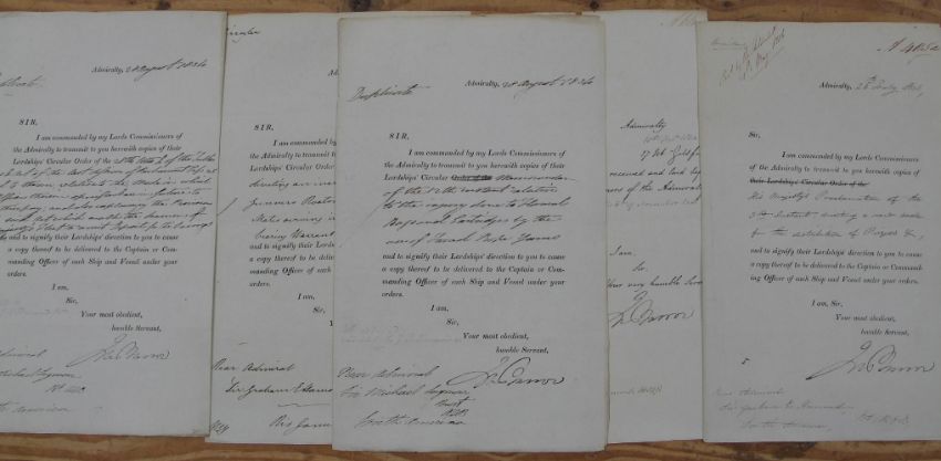 ARCTIC: five documents signed by Sir John Barrow (1764-1845) as Second Secretary to the Admiralty, 1830s.