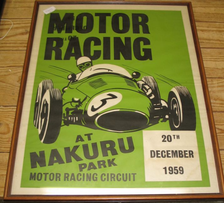 [POSTER / MOTOR RACING] "Motor Racing, at Nakuru Park...20th December, 1959", green & black, central fold, 25 x 19 inches, f. & g.
