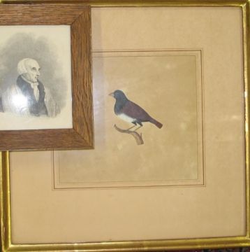INDIA: Original Indian school gouache / watercolour of an Indian bird, framed. With a small, engraved portrait of Sir Charles D'Oyly (1781-1845, of the Behar lithographic press), oak frame.