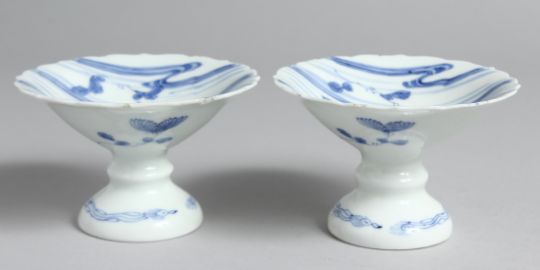 A SMALL PAIR OF JAPANESE HIRADO BLUE AND WHITE PORCELAIN PEDESTAL DISHES. 10cm diameter.