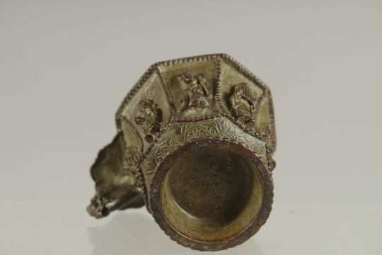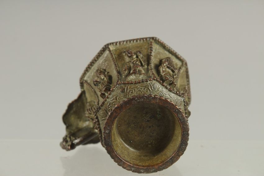 A CHINESE BRONZE CUP WITH RELIEF CAST FIGURES, mark to base possibly Da Tang Zhen Guan (true official ware of great Tang dynasty), 6cm high.